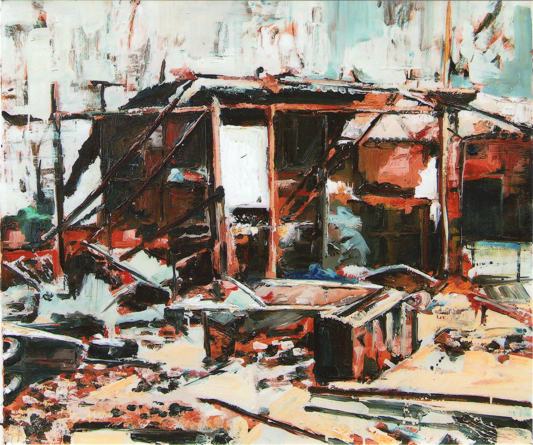 ” [...] Non-esseri e non-luoghi divengono astrazioni della loro consistenza figurativa, emergono dall’impasto materico con passaggi di pennello associati a graffiature del colore per lasciarsi solo blandamente lambire e mai penetrare, mai attraversare dal giudizio critico, quasi deferenti e casuali. Allegorie dunque della contemporanea e moderna incapacità di evolvere, dell’appagante quanto innaturale apatia che ci schiaccia e ci appiattisce nel tempo, accentuata da sapienti tagli fotografici che bloccano gli sviluppi narrativi e creano (per poi rapidamente stemperare) tensioni tra la realtà osservata e la sua trasposizione pittorica [...]“.